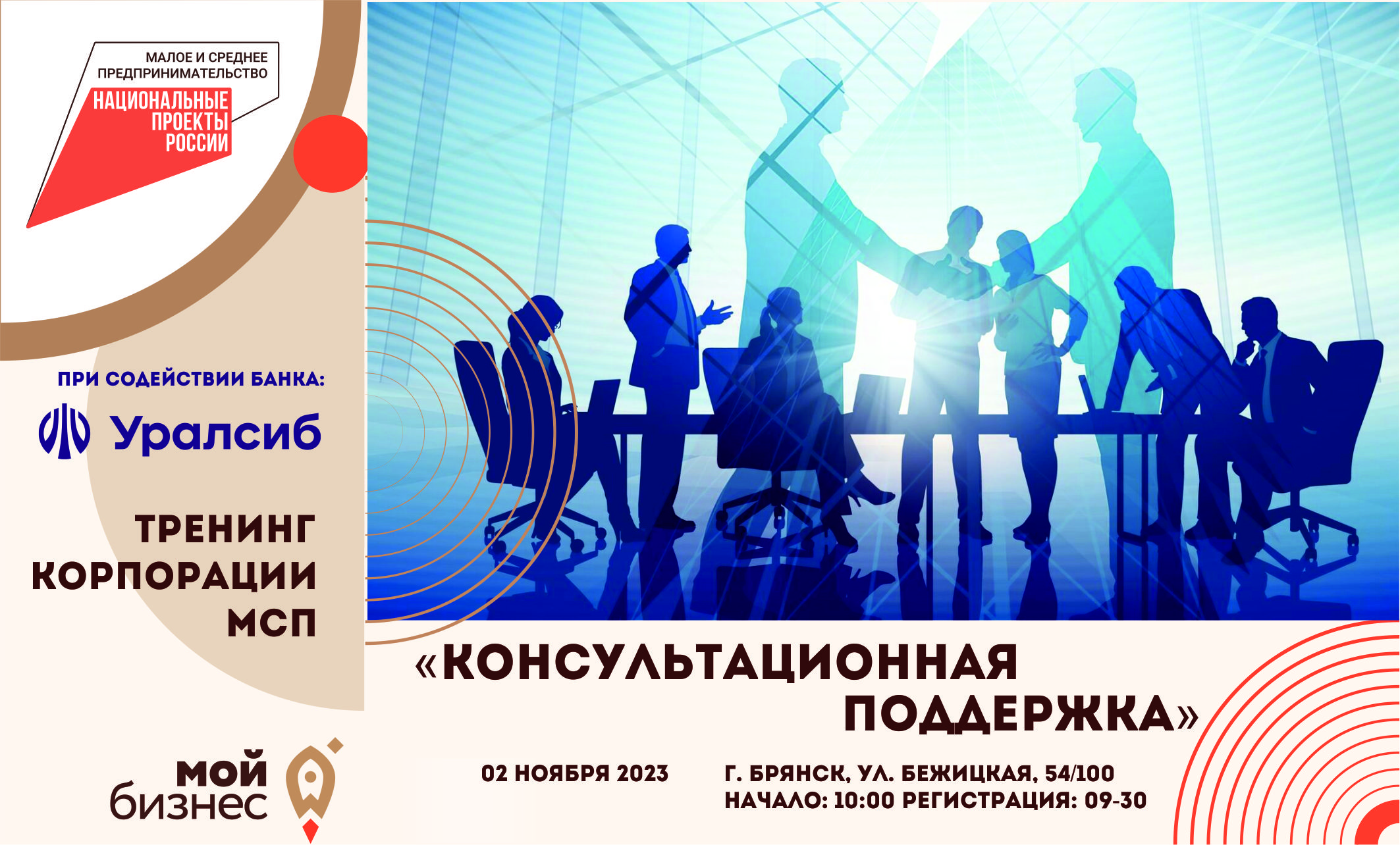 Центр «Мой бизнес» Брянской области приглашает потенциальных и начинающих предпринимателей региона на тренинг «Консультационная поддержка» 02 ноября. Мероприятие будет проведено в рамках реализации нацпроекта «Малое и среднее предпринимательство», при содействии банка ПАО "БАНК УРАЛСИБ".