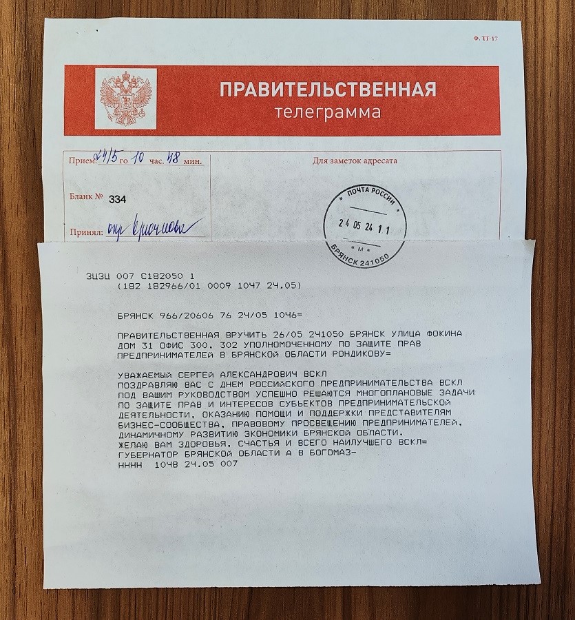 В адрес Уполномоченного по защите прав предпринимателей в Брянской области Сергея Рондикова поступило поздравление Губернатора Брянской области Александра Богомаза с Днем российского предпринимательства.