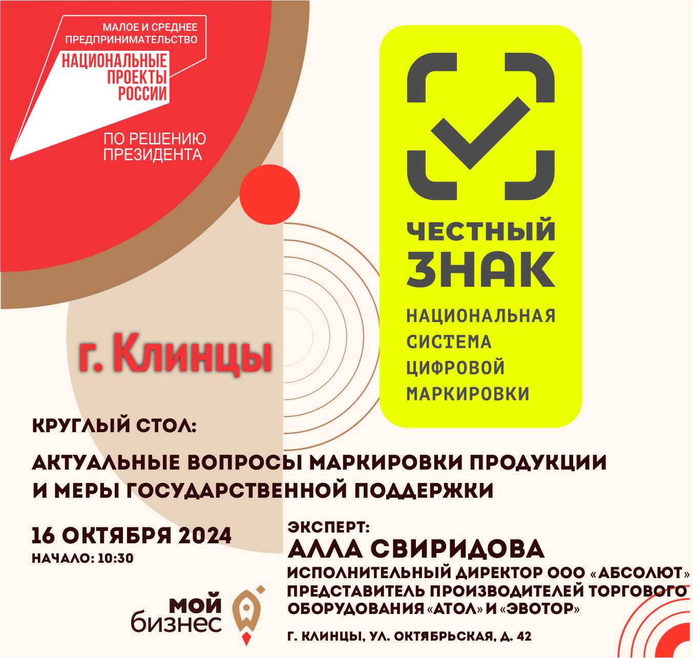 Обсудить систему «Честный знак», задать вопросы и узнать больше о мерах господдержки приглашаются предприниматели Клинцовского района на встречу с экспертами центра «Мой бизнес» на круглом столе «Актуальные вопросы маркировки продукции и меры государственной поддержки». Дата: 16 октября с 10:30 до 12:30 по адресу: Брянская область, Клинцовский район, г. Клинцы, ул. Октябрьская, д.42.