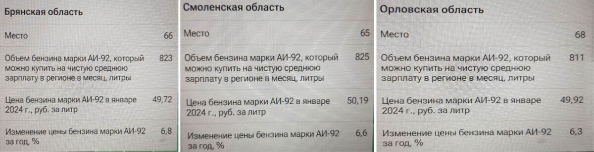 Сами цены и их динамика по-прежнему существенно отличаются от региона к региону. В январе 2024 года средние цены на автомобильный бензин марки АИ-92 в российских регионах изменялись в диапазоне от 47,14 рубля за литр до 66,19 рубля, при общероссийском уровне 50,56 рубля за литр.
