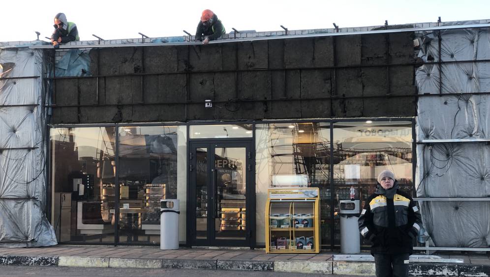 Возле Навли с АЗС «Роснефти» сняли обшивку для смены логотипа и дизайна. Работы оказались весьма трудоемкими.