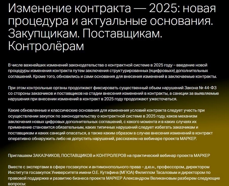 20 февраля состоялся вебинар на тему «Изменение контракта — 2025: новая процедура и актуальные основания. Закупщикам. Поставщикам. Контролерам»