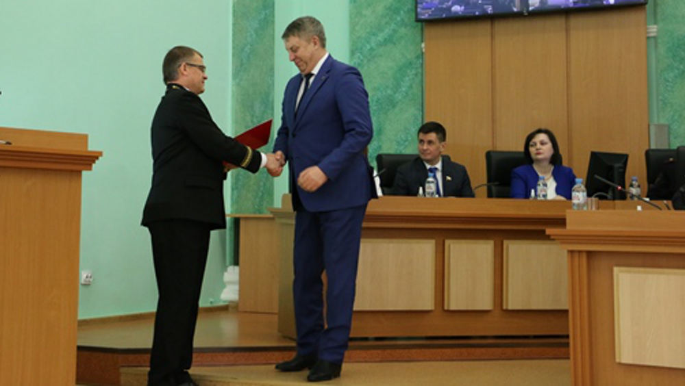 Председатель Брянского облсуда в торжественной обстановке на заседании облдумы вручил губернатору Брянской области Александру Богомазу медаль судебного департамента при Верховном су