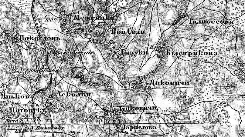 Деревня Газуки [положенiе имѣетъ по горѣ и по косогорѣ, надъ неболшимъ яромъ] при рѣчке Вабли на лѣвой сторонѣ, (при чистомъ зъ трохъ сторонъ поли и неболшой съ четвертой стороны рощѣ), по дороги проселочной. Разстоянiемъ отъ села Нового въ одну, отъ села Яцковичъ въ 1, отъ деревни Вистрикова въ 2, отъ Луцковичъ въ 3 верстахъ.