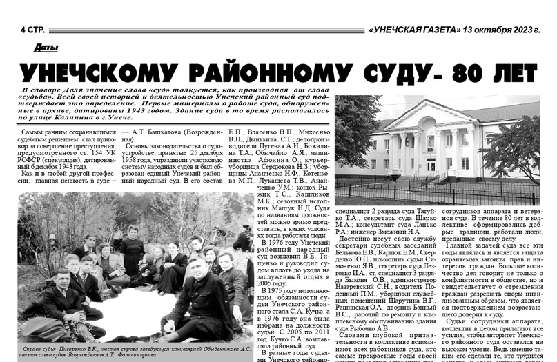 В "Унечской газете" от 13 октября вышла статья, посвященная грядущему юбилею Унечского районного суда