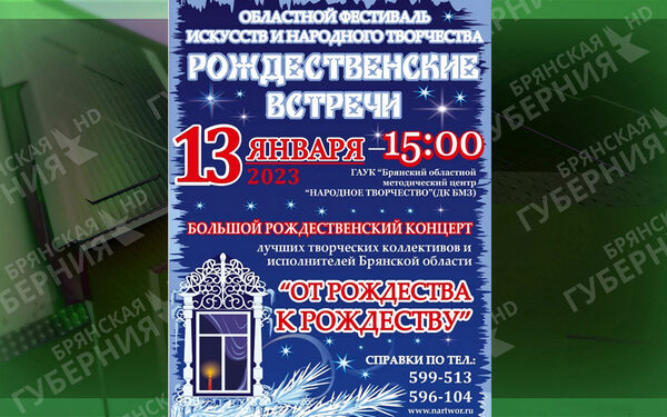 Во Дворце культуры БМЗ Брянского областного методического центра «Народное творчество» 13 января в 15 часов пройдёт праздничный концерт «От Рождества к Рождеству».