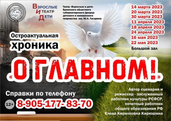На сцене губернаторского Дворца детского и юношеского творчества Брянска состоялась премьера спектакля «О главном!» театра «Взрослые и дети», жанр обозначен как остроактуальная хроника, рассказывает сайт РИА «Стрела» .