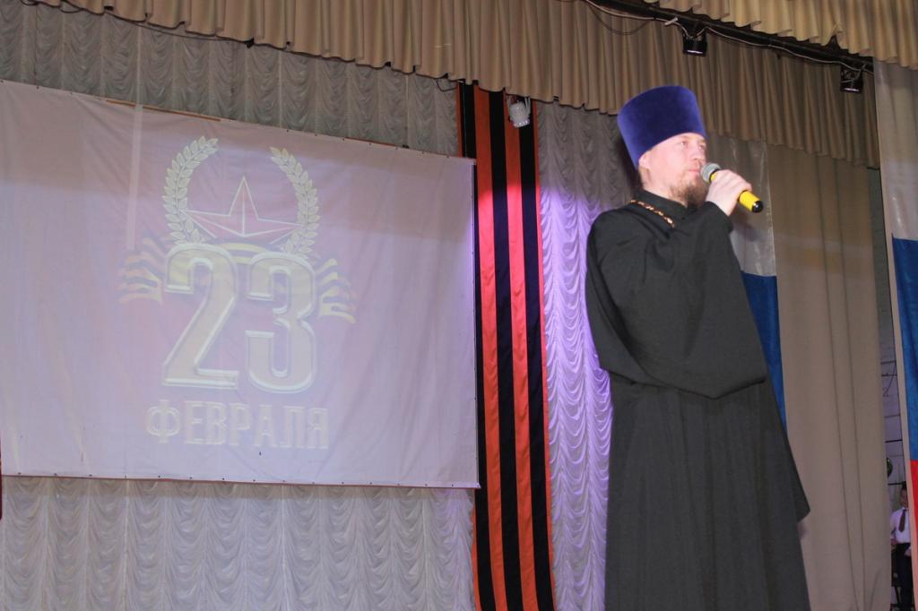 На концерте присутствовали представители духовенства - благочинный Карачевского церковного округа иерей Николай Черный и протоиерей Александр Катунин, настоятель Соборного храма во имя Архангела Михаила. От лица духовенства Карачевского благочиния присутствующих поздравил иерей Николай Черный: «День защитника Отечества является для нас символом отваги, мужества и патриотизма, а также напоминает нам о славных подвигах наших отцов и дедов, всех, кто на протяжении нашей тысячелетней истории отважно защищали нашу землю, созидали наше великое государство Российское, не жалея себя. Сегодня мы особо чтим память всех погибших воинов, послуживших сохранению мира и целостности нашей страны, вдохновляемся их подвигами. Благодарим всех, кто находит время и возможность в той или иной степени помогать солдатам». Его Преподобие напомнил о приближающихся днях Великого поста и пригласил земляков в храмы на совместную молитву о сохранении жизней и скорейшей победе нашего славного российского воинства.