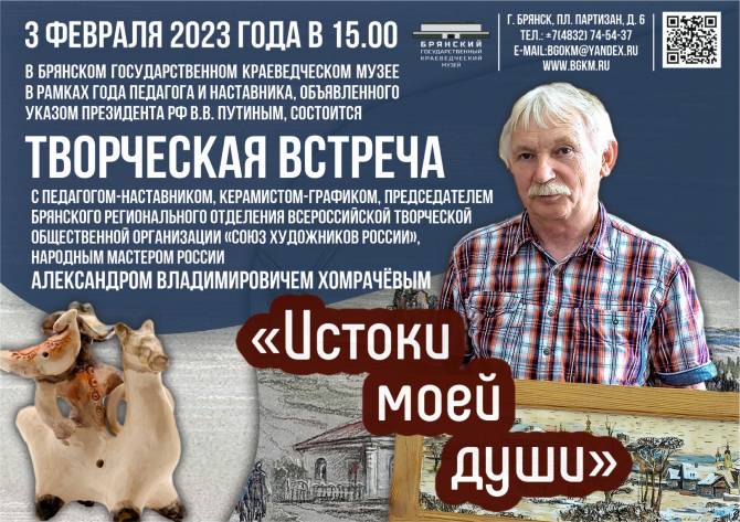 Творческая встреча «Истоки моей души» с педагогом-наставником, керамистом-графиком, председателем Брянского регионального отделения всероссийской творческой общественной организации «Союз художников России», народным мастером России Александром Хомрачёвым состоится в Брянском краеведческом музее в пятницу, 3 февраля. Начало — в 15:00.