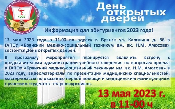 БМСТ имени академика Н.М. Амосова анонсировал проведение дня открытых дверей 13 мая. Мероприятие состоится в Брянске, по улице Калинина, дом 86. Начало — в 11 часов утра, сообщается на сайте ссуза.