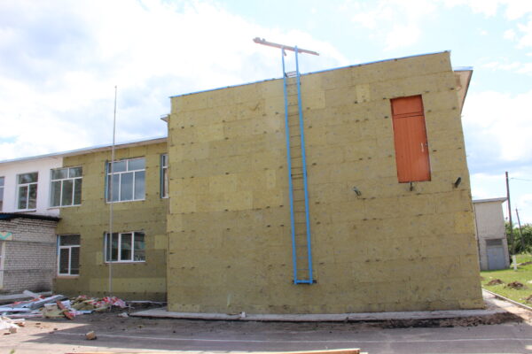 Фасад пристройки утеплён, также на ней заменена кровля. По периметру школы появилась отмостка, работы по её строительству продолжаются.