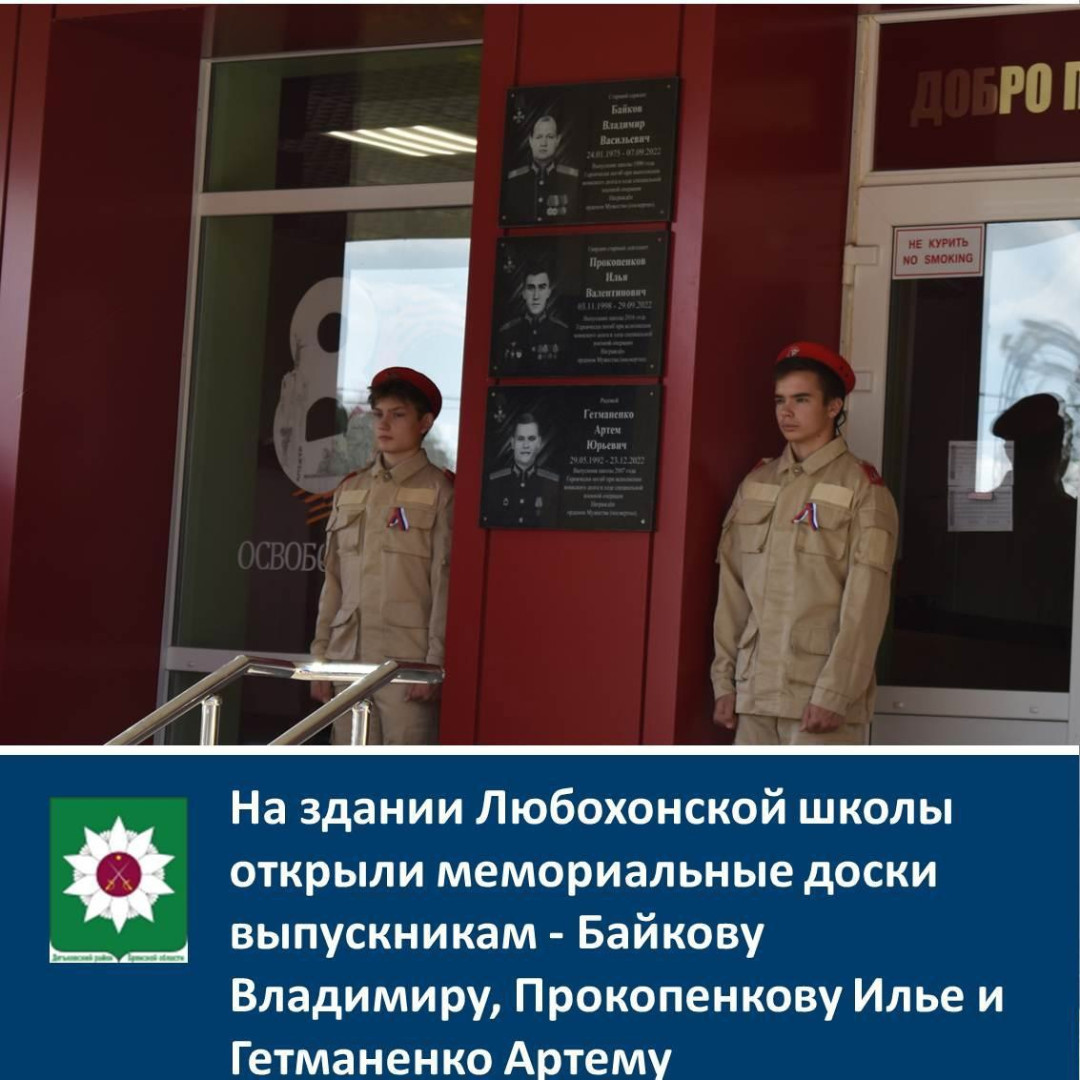 27 сентября в МАОУ Любохонская СОШ состоялось открытие мемориальных досок памяти выпускников школы Байкову Владимиру Васильевичу, Прокопенкову Илье Валентиновичу и Гетманенко Артему Юрьевичу,