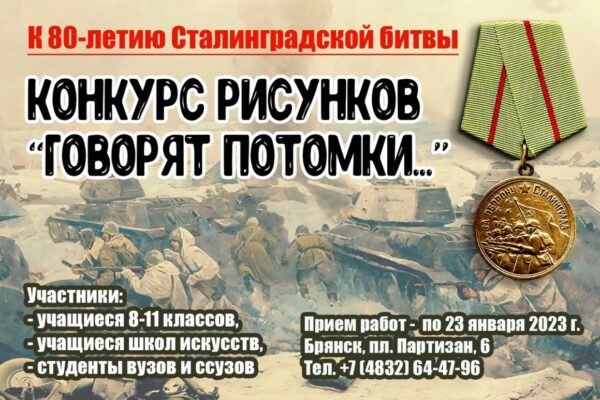 В Брянском государственном краеведческом музее продолжают принимать заявки на областной конкурс рисунков «Говорят потомки…» Он посвящен 80-летию Победы в Сталинградской битве, целью которого является воспитание посредством искусства интереса к отечественной истории, уважения к героическому прошлому нашей страны. Участниками конкурса могут стать учащиеся школ 8-11 классов, учащиеся школ искусств, студенты вузов и ссузов. Прием заявок и конкурсных работ продлится до 23 января текущего года включительно. А 2 февраля состоится награждение дипломами победителей.
