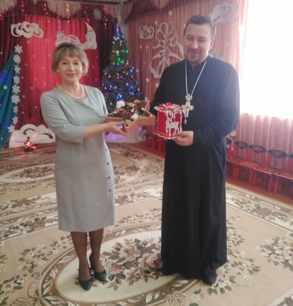 Екатерина Алексеевна от лица всего коллектива детского сада поблагодарила священника за столь значимый дар в преддверии Рождества Христова и передала протоиерею Петру новогодние сувениры, которые воспитатели с детьми изготовили своими руками для воспитанников воскресной школы при храме Святителя Николая г. Унеча.