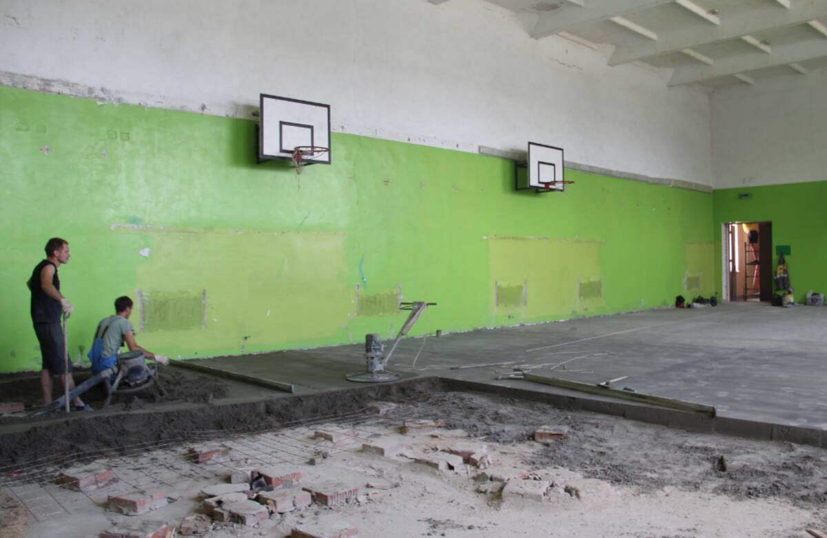 Большинство строителей сейчас трудятся в спортивном зале. Здесь они делают сухую стяжку под спортивный линолеум, которым покроют пол. В раздевалках, санузлах уложена новая плитка, монтируют навесные потолки. Впереди – покраска стен в спортивном зале. В ближайшее время начнется поставка новой школьной мебели.