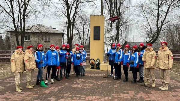 Затем «Снeжный дeсант» вместе с юнармейцами школы приняли участие в благоустройстве памятных мест. Они навели порядок у памятника руководителю подпольной комсомольской организации П. Г. Незымaеву, а также на братской могиле советских воинов в Комаричах.