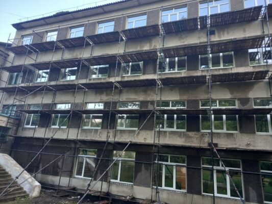 В поликлинике завершаются работы по заливке полов на всех этажах здания, ведется и ремонт помещений МФЦ.