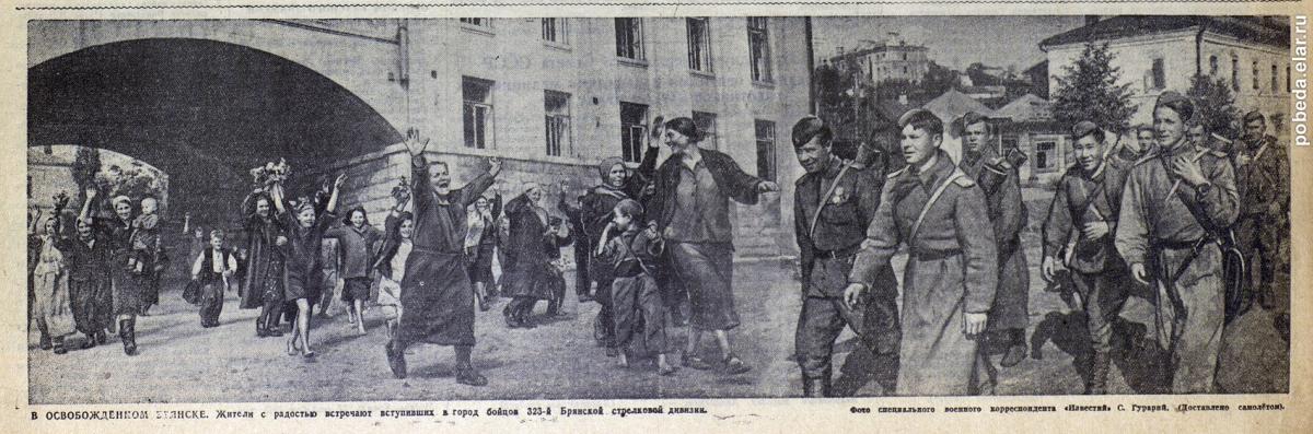 И вот, Брянск наш! Радостно идти знакомыми улицами. Вчера по ним прошли бойцы и офицеры прославленных Брянских дивизий и частей. Они не задержались в городе и часу, враг бежал, его нельзя было упустить. Вчера в городе почти не было населения. Сегодня тысячи раз говорится: «Спасибо героям-брянцам!» Цветами осыпают женщины и дети, вернувшиеся в город, тех бойцов, чей путь на запад сегодня лежит через Брянск...»