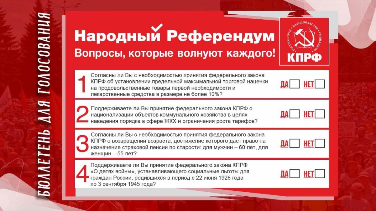 Ю.В. Афонин сообщил о работе на уровне Президиума ЦК КПРФ по подготовке Народного референдума. Он отметил, что сейчас перед партией стоит задача заручиться максимальной поддержкой законодательных инициатив коммунистов со стороны граждан. Выступающий рассказал о тех организационных мероприятиях, которые КПРФ проводит в рамках данной работы. «Если мы донесем наши предложения до населения, успех в ходе избирательных кампаний будет высоким», - подчеркнул он.