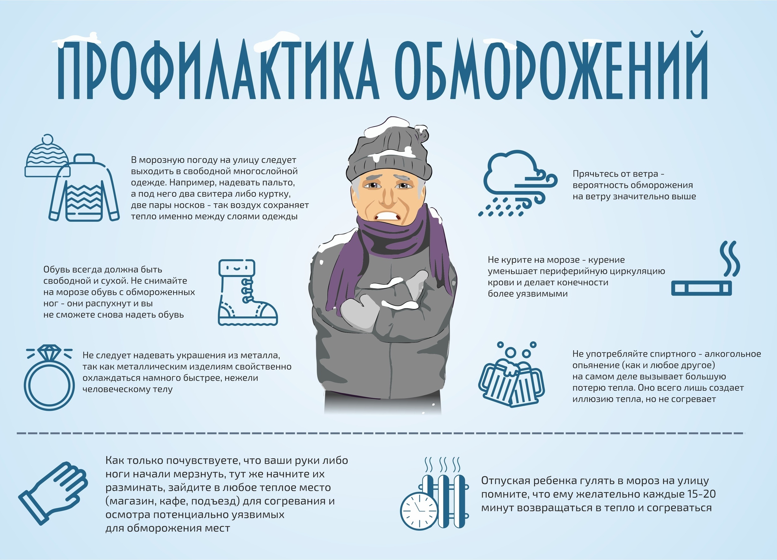 Старайтесь не выходить на улицу в сильный мороз. Если Вам необходимо выйти, оденьтесь потеплее, помните, что «многослойная» одежда лучше сохраняет тепло – лучше одеть несколько слоев сравнительно легкой одежды. Одежда не должна быть тесной. Старайтесь, чтобы шея и запястья были утеплены, так как именно через эти части тела тепло в мороз теряется наиболее интенсивно. Не забывайте, что рукавицы лучше сохраняют тепло, чем перчатки. Используйте шарфы – они хорошо защищают от холода и никогда не выходят из моды. При сильном морозе, особенно при ветре, головной убор должен быть хорошо подогнан, уши должны быть обязательно закрыты. Берегите ноги от холода, их легче всего отморозить. Обувь не должна быть тесной. Не перетягивайте ноги туго шнурками, тесемками. Обувь должна быть сухая. Не носите на морозе металлических (в том числе золотых, серебряных) украшений – колец, серѐжек и т.д.: металл остывает гораздо быстрее тела до низких температур, вследствие чего возможно «прилипание» к коже с болевыми ощущениями и холодовыми травмами; кольца на пальцах затрудняют нормальную циркуляцию крови. В мороз старайтесь избегать контакта голой кожи с металлом. Категорически нельзя: пытаться быстро согревать отмороженные места (грелки, горячий душ, тѐплая ванна, интенсивное растирание, согревание у открытого огня и т.п.), так как при этом поражѐнные ткани, нагреваясь, но не получая из крови кислорода, чернеют и отмирают; растирать отмороженные участки снегом, что влечѐт повреждение мелкими льдинками поверхности кожи и занесение инфекции; употреблять для согревания алкоголь (он вызывает сначала расширение, а затем резкое сужение кровеносных сосудов, что ухудшает снабжение поражѐнных участков кислородом); натирать отмороженные участки тела жиром, так как это нарушает кожное дыхание и препятствует выводу из пор продуктов распада поражѐнных тканей.Правила поведения в условиях снегопадов и оттепели