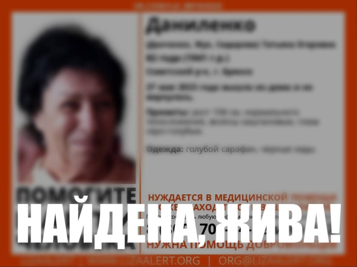 27 мая она вышла из дома и не вернулась. Сегодня, 28 мая, добровольцы поисково-спасательного отряда «Лиза Алерт» сообщили, что Татьяна Егоровна найдена живой.