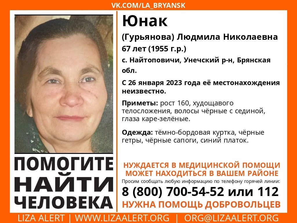 26 января в селе Найтоповичи Унечского района пропала Людмила Николаевна Юнак (Гурьянова). 67-летняя женщина ушла из дома в неизвестном направлении.