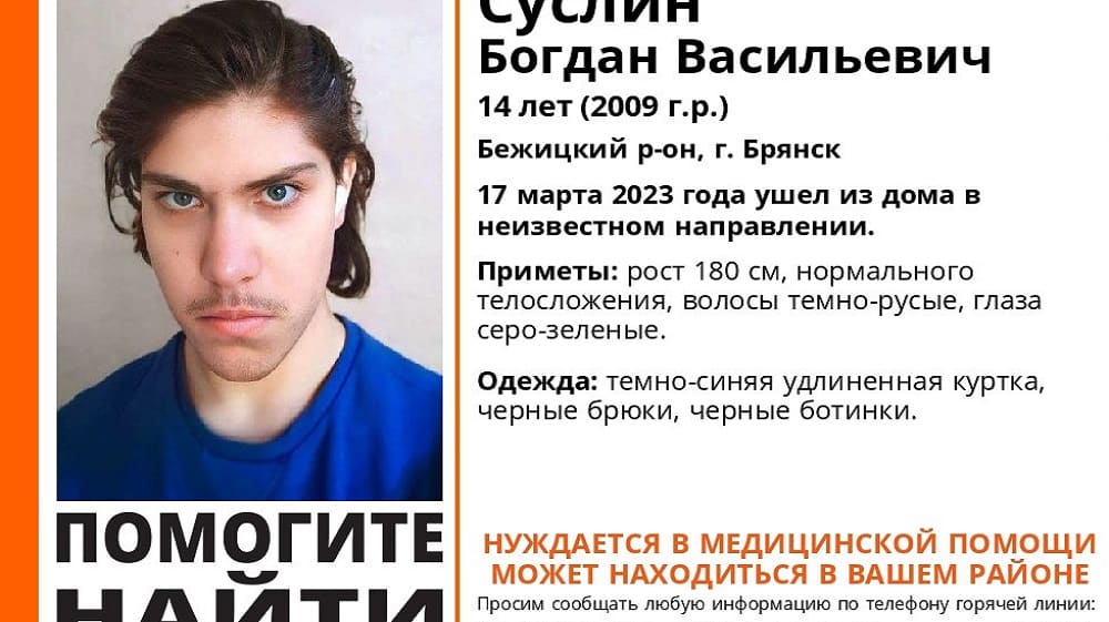 14-летний Богдан Суслин пропал без вести 17 марта в Бежицком районе.
