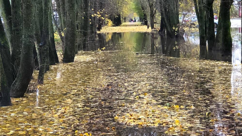 После каждого сильного дождя большое пространство, включая тротуары напротив магазина «Магнит», заливает водой. Но если летом грязная жидкость вкупе с поломанными ветками и мусором наводит уныние, то теперь все иначе. Лужа украшена желтыми листьями, многие даже фотографируются в этом месте и предлагают знакомым определить, где оно расположено.