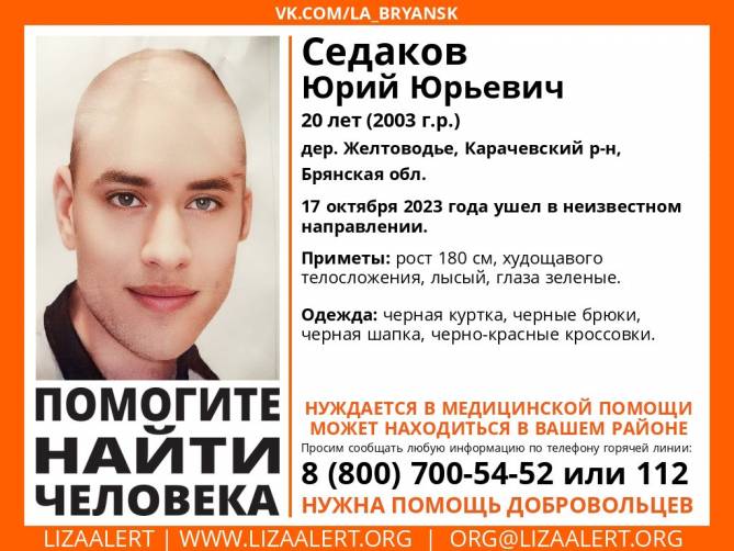 В Брянской области пропал 20-летний житель деревни Желтоводье Карачевского района Юрий Седаков. О местонахождении парня неизвестно с 17 октября.