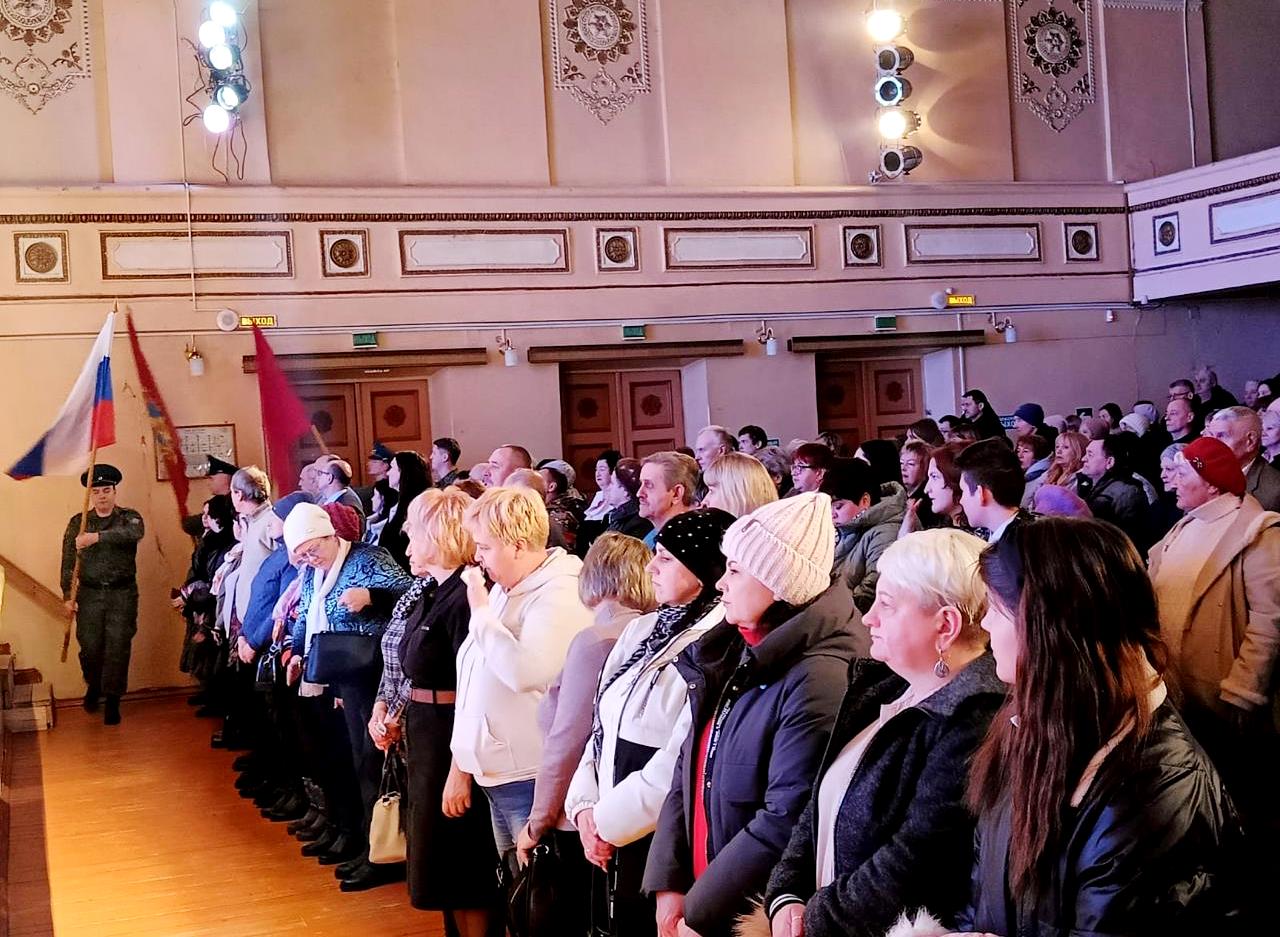 Открыто мероприятие было гимном России и внесением трёх знамён: государства, области и округа. Почётными гостями на концерте были, конечно, военные и их близкие." "