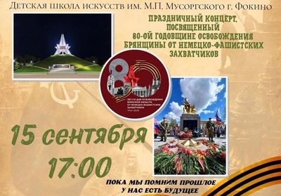 15 сентября в 17:00 в Детской Школе Искусств им. М.П. Мусоргского г. Фокино состоится праздничный концерт, посвященное 80-ой годовщине освобождения Брянщины от немецко-фашистских захватчиков