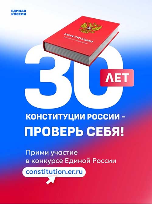 До 25 ноября на сайте пройдет конкурс «30 лет Конституции России — проверь себя!». Принять участие в нём могут все желающие старше 18 лет по ссылке https://constitution.er.ru?u=dYvzBhSYoRoF9Bqi82KNhz