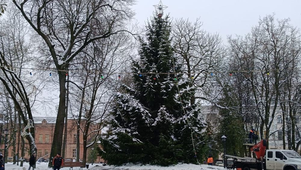 В Круглом сквере Брянска главную городскую ёлку украсили гирляндами и пятиконечной звездой, также к праздничному дереву подключили иллюминацию.