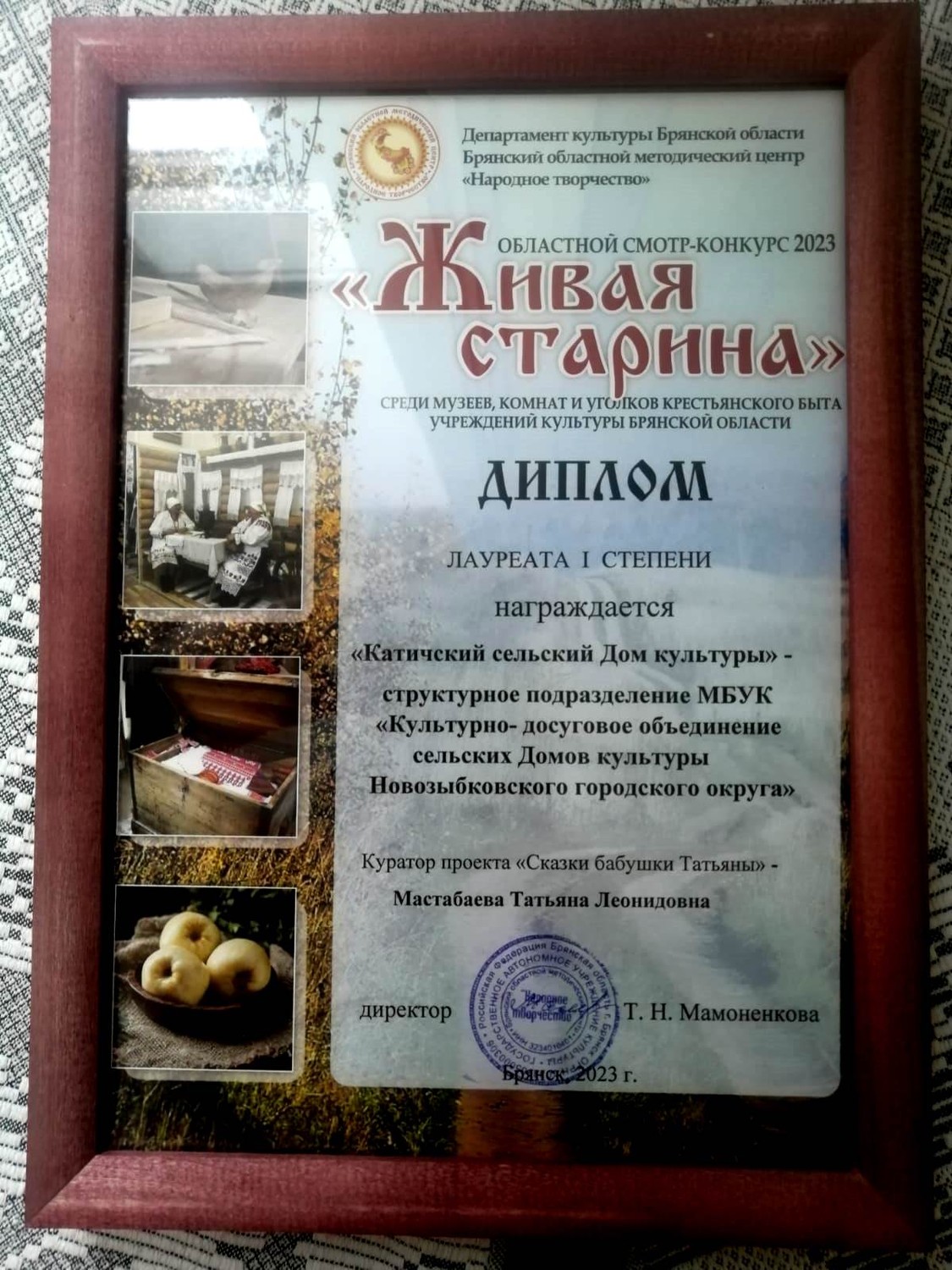 Новозыбковский городской округ в данном смотре - конкурсе представила Мастабаева Татьяна Леонидовна – художественный руководитель Катичского СДК. Она же является куратором проекта «В гостях у бабушки Татьяны». По итогам смотра конкурса «Катичский сельский Дом культуры» – структурное подразделение Муниципальное бюджетное учреждение культуры «Культурно - досуговое объединение сельских Домов культуры Новозыбковского городского округа» стал ЛАУРЕАТОМ I степени. Победителям вручены дипломы и ценные подарки.