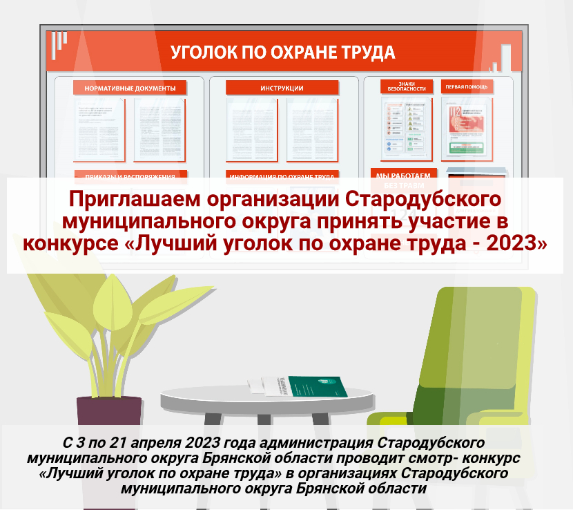 С 3 по 21 апреля 2023 года администрация Стародубского муниципального округа Брянской области проводит смотр- конкурс «Лучший уголок по охране труда» в организациях Стародубского муниципального округа Брянской области.
