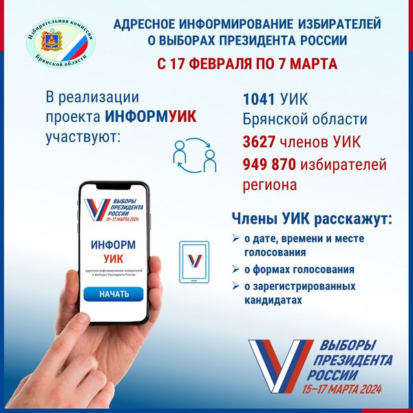 В период с 17 февраля по 7 марта 2024 года будет организовано проведение адресного информирования и оповещения избирателей о выборах Президента Российской Федерации способом поквартирного (подомового) обхода, в том числе с использованием специального мобильного приложения (проект «ИнформУИК»).