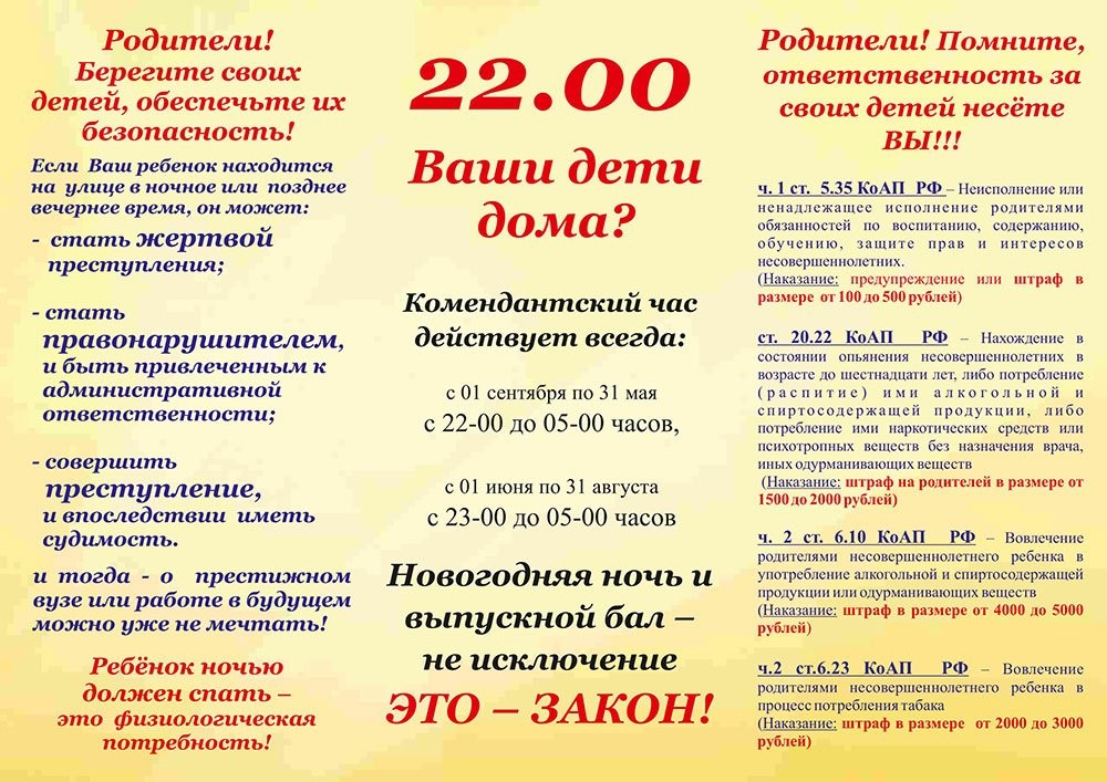 - единый период для запрета пребывания на улице без взрослых составляет с 22-00 до 6-00;