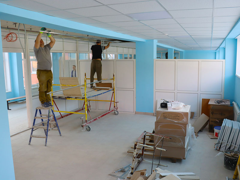Полторы недели назад подрядчик приступил к спортзалу. Там появится новое освещение, современное напольное игровое покрытие. Пока же штукатурятся стены, подготавливается потолок.