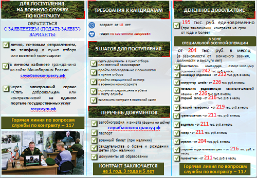 Полную информацию можно получить в пункте отбора на военную службу по контракту по адресу: г. Брянск, ул. Дзержинского, д. 30. ( На Яндекс Картах , 2GIS )