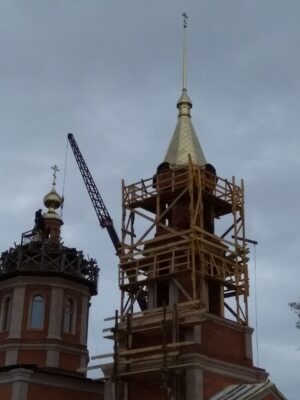 В Алешковичах на храме установили шпиль и купол с крестами