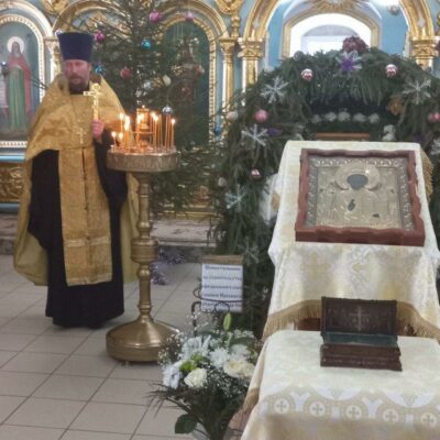Святыню встретил протоиерей Владимир Сафронов. У ковчега с мощами совершили молебен.