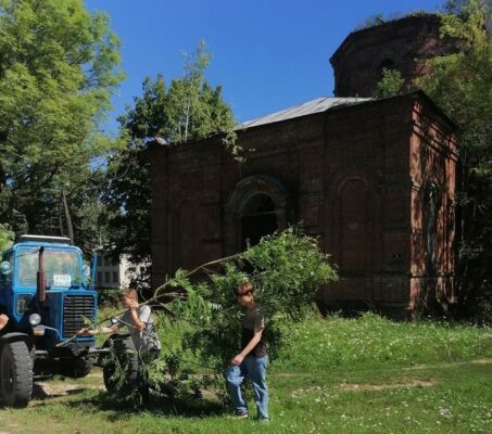 Фронт их был очень большой, так как территория эта сильно заросла кустарником. Понадобился и второй трактор, и ещё рабочие руки. На помощь пришло СПК «Чапаева». Руководитель сельхозпредприятия Виктор Михайлович Довыденко выделил необходимую технику. Вместе с ним пришли и два работника СПК: Михаил Васильевич Дикий и Сергей Васильевич Рощин. Все трудились дружно и слажено, несмотря на жаркую погоду. Когда одна из пил вышла из строя, свою пилу предоставил местный житель, чей дом расположен недалеко от храма.