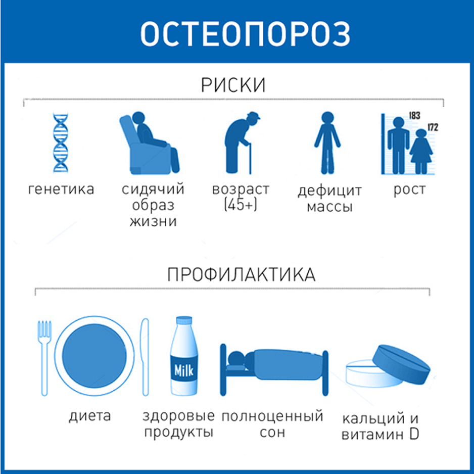 Среди множества факторов риска остеопороза питание играет важную роль, хоть и не ведущую. Курение и употребление алкоголя, низкий уровень или избыточная физическая нагрузка, пониженное поступление кальция и витамина D.