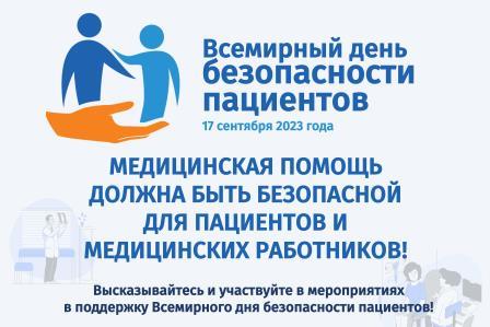 Министерством здравоохранения Российской Федерации совместно с Росздравнадзором реализуется план мероприятий, посвященных Всемирному дню безопасности пациентов в 2023 году. Лозунг Всемирного дня безопасности пациентов в текущем году – «Вовлечение пациентов для обеспечения безопасного оказания медицинской помощи», потому что вклад пациентов, членов их семей и ухаживающих за ними лиц является важнейшим в обеспечении безопасности при оказании медицинской помощи. Зарубежные и отечественные исследования позволяют говорить о том, что партнерские отношения с пациентами при оказании помощи обеспечивают более высокие показатели безопасности и удовлетворенности и формируют целостную качественную систему здравоохранения.