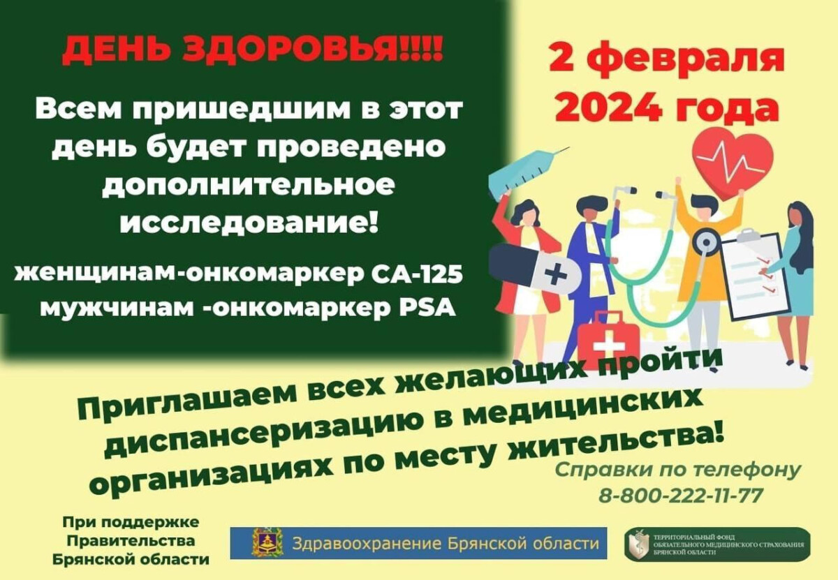 2 февраля в Брянской области состоится День здоровья. Пройти диспансеризацию в медицинской организации по месту жительства призывают в профильном Департаменте.