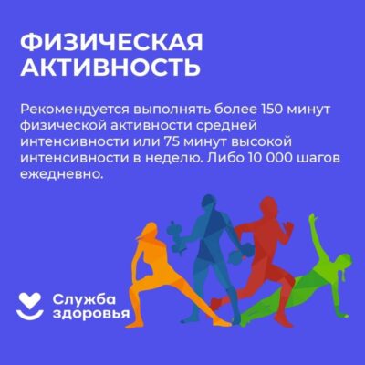 Основные рекомендации: взрослому – минимум 150-300 минут умеренной физической активности или минимум 75-150 минут интенсивной физической активности или эквивалентной комбинации в течение недели; детям – не менее 1 часа в день; для получения дополнительных преимуществ – увеличить время умеренной физической активности до и более 300 минут или время интенсивной физической активности до и более 150 минут в неделю.