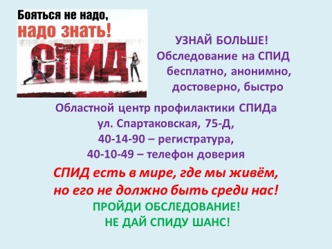 ВИЧ-инфекция среди населения распространяется преимущественно половым путём. 80% новых случаев приходится на людей в возрасте от 20 до 40 лет. Поэтому тем, кто имеет нескольких, пусть даже постоянных, половых партнёров и практикует незащищённые половые контакты, мы настоятельно рекомендуем пройти бесплатное (можно анонимное) обследование на ВИЧ в центре профилактики СПИДа.