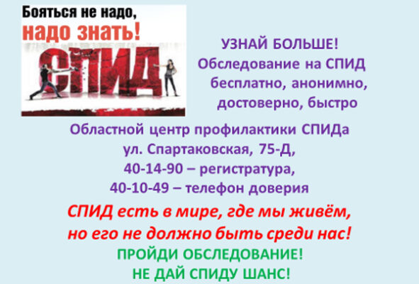 Уже давно ВИЧ-инфекция распространяется преимущественно половым путём среди всего населения. 80% новых случаев приходится на людей в возрасте от 20 до 40 лет. Поэтому тем, кто имеет нескольких, пусть даже постоянных, половых партнёров и практикует незащищённые (без презерватива) половые контакты, мы настоятельно рекомендуем пройти бесплатное (можно анонимное) обследование на ВИЧ в центре профилактики СПИДа.