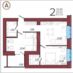 - Общая площадь: 67.2 м²