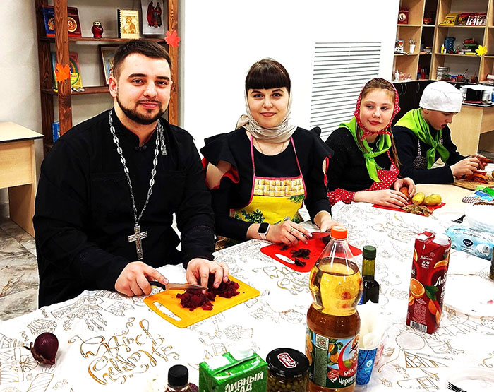 Батюшка и Мария Витальевна рассказали ребятам об очень вкусных постных блюдах. Одним из таких является салат – винегрет, который все присутствующие, включая ребят и их родителей, совместно приготовили. С большим восторгом ребята чистили и нарезали овощи. Многие принесли постные картофельные бутерброды. Ребята потрудились на славу, и после занятия состоялась общая трапеза.